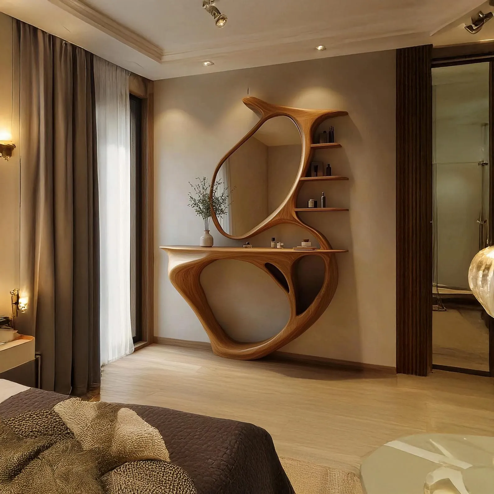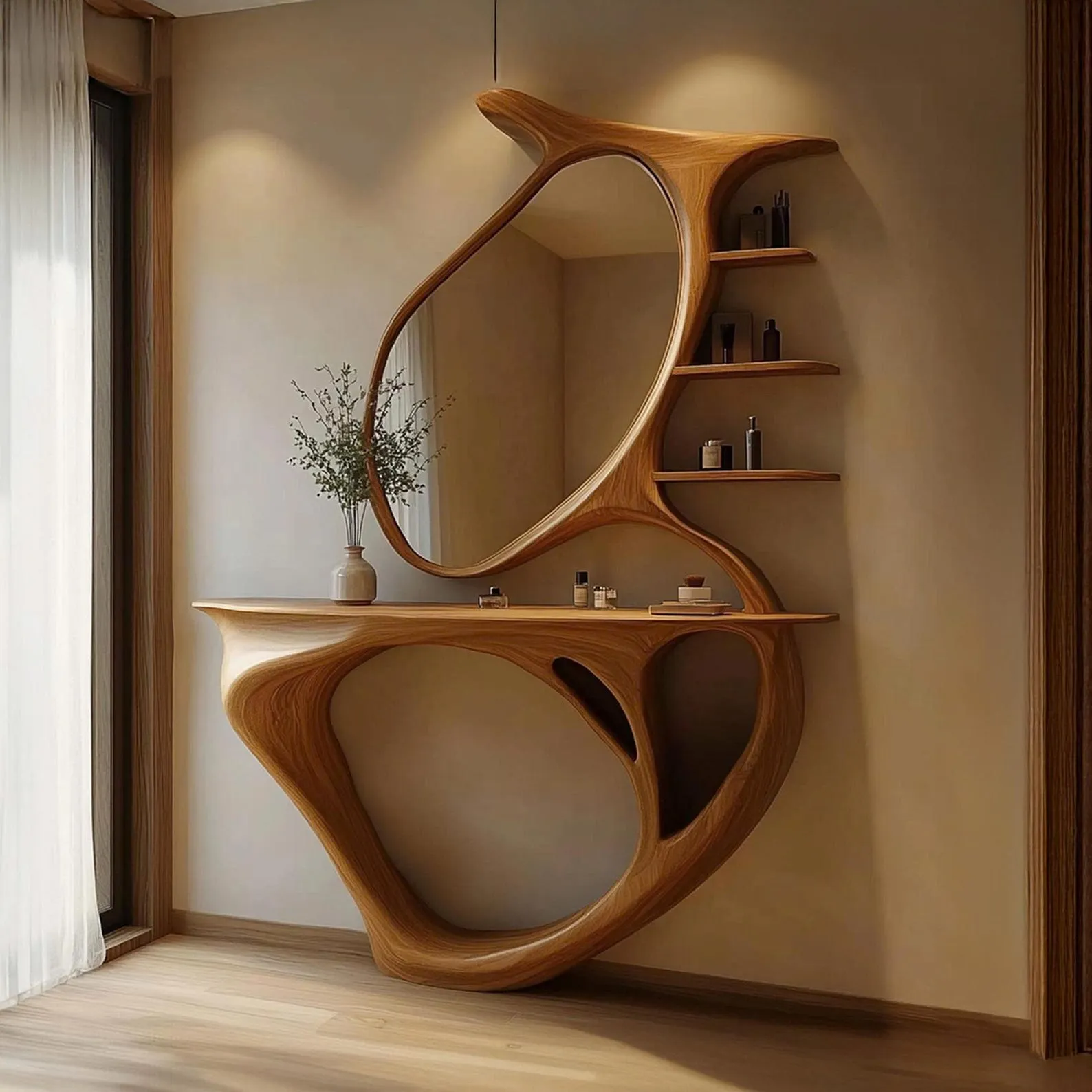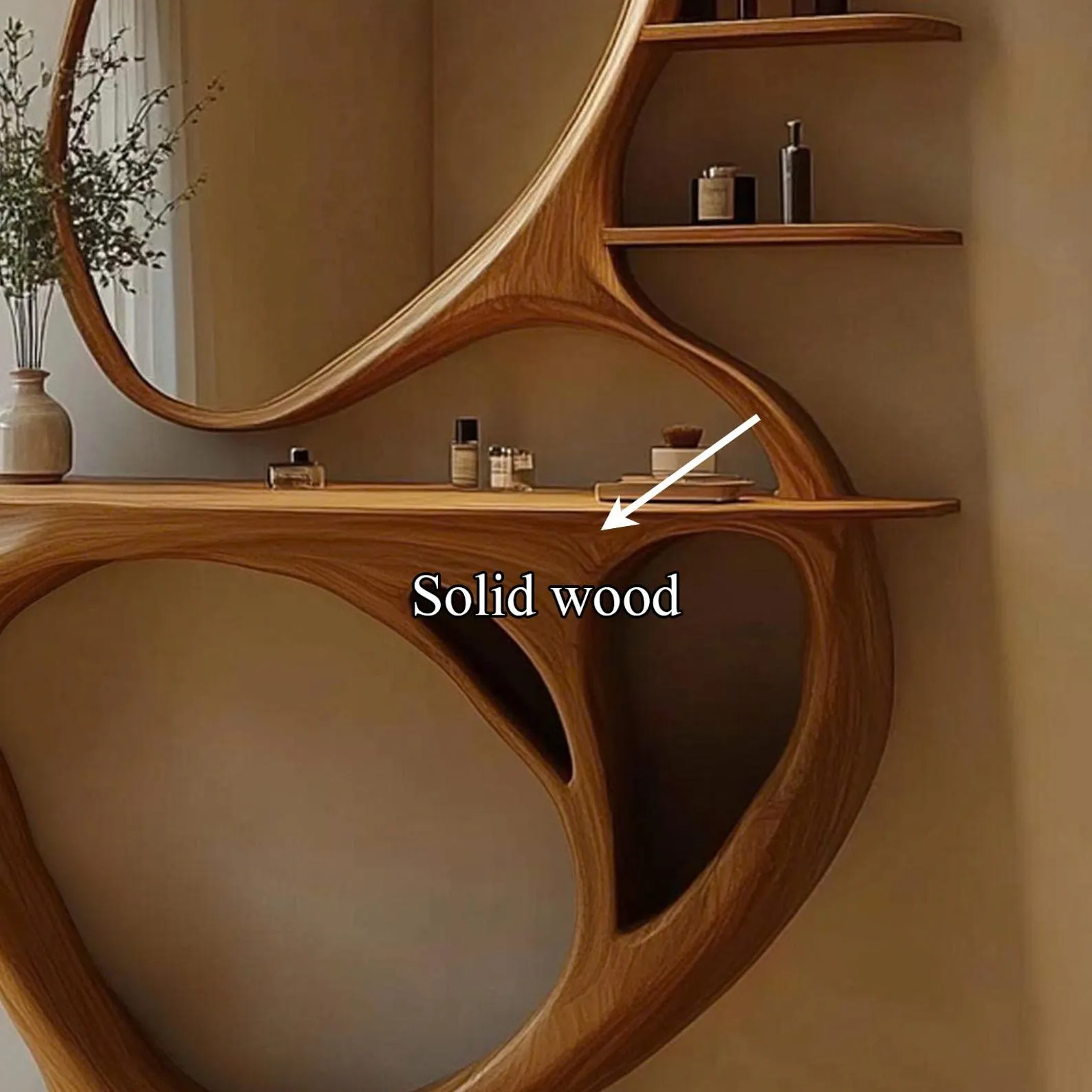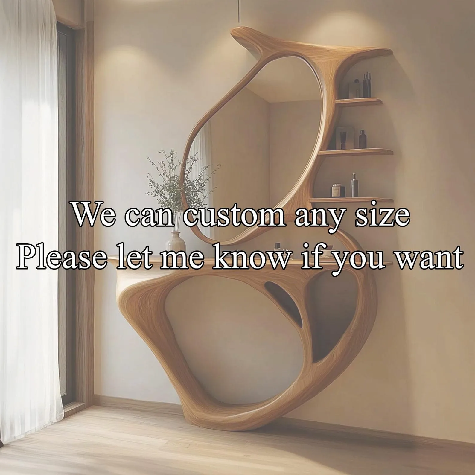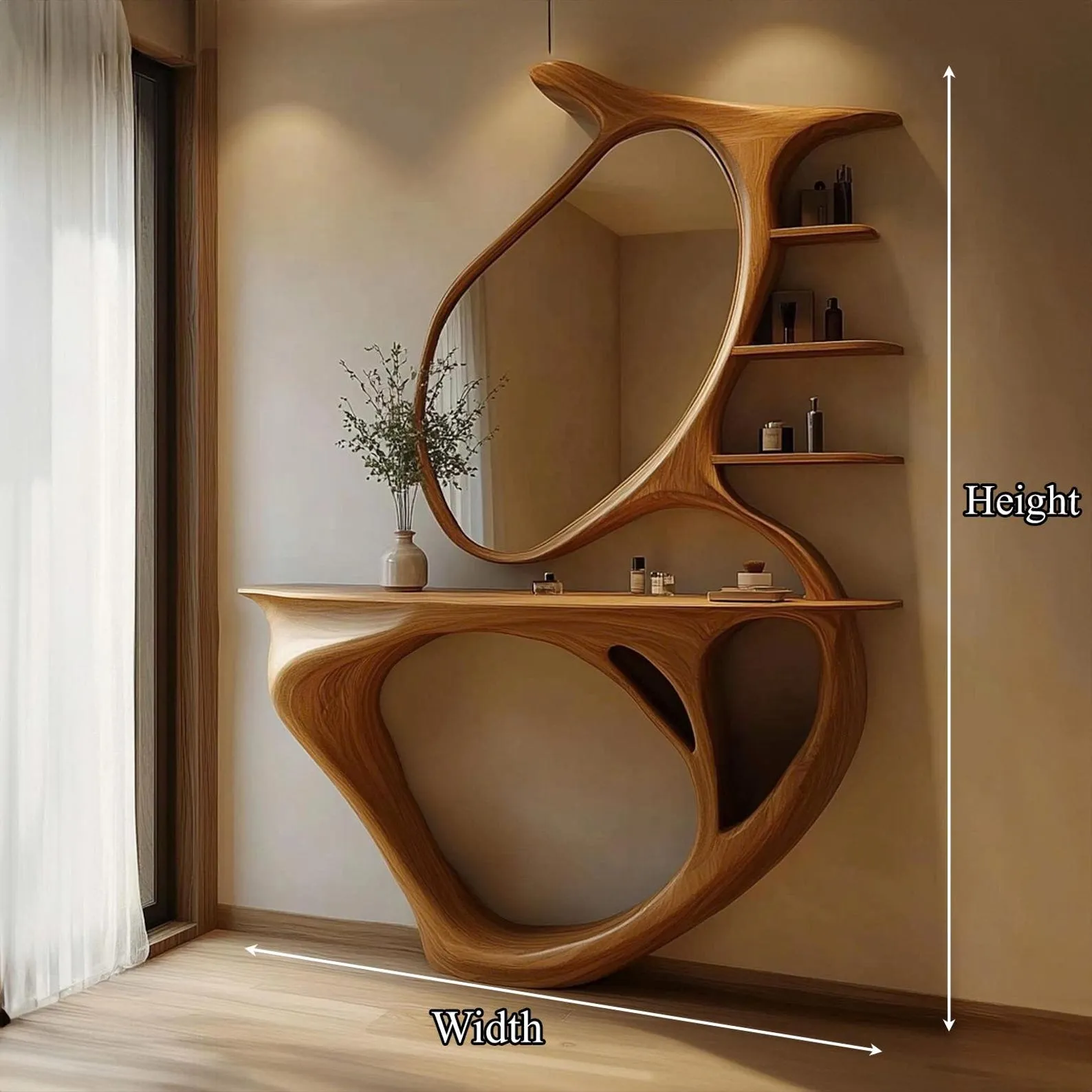 This farmhouse live edge wood vanity table with mirror and shelves is designed for cozy bathrooms or dressing corners. The solid wood top keeps a natural edge, while open side or lower shelves offer space for towels, baskets and everyday essentials. A coordinating mirror helps create a practical spot for skincare and daily routines.
