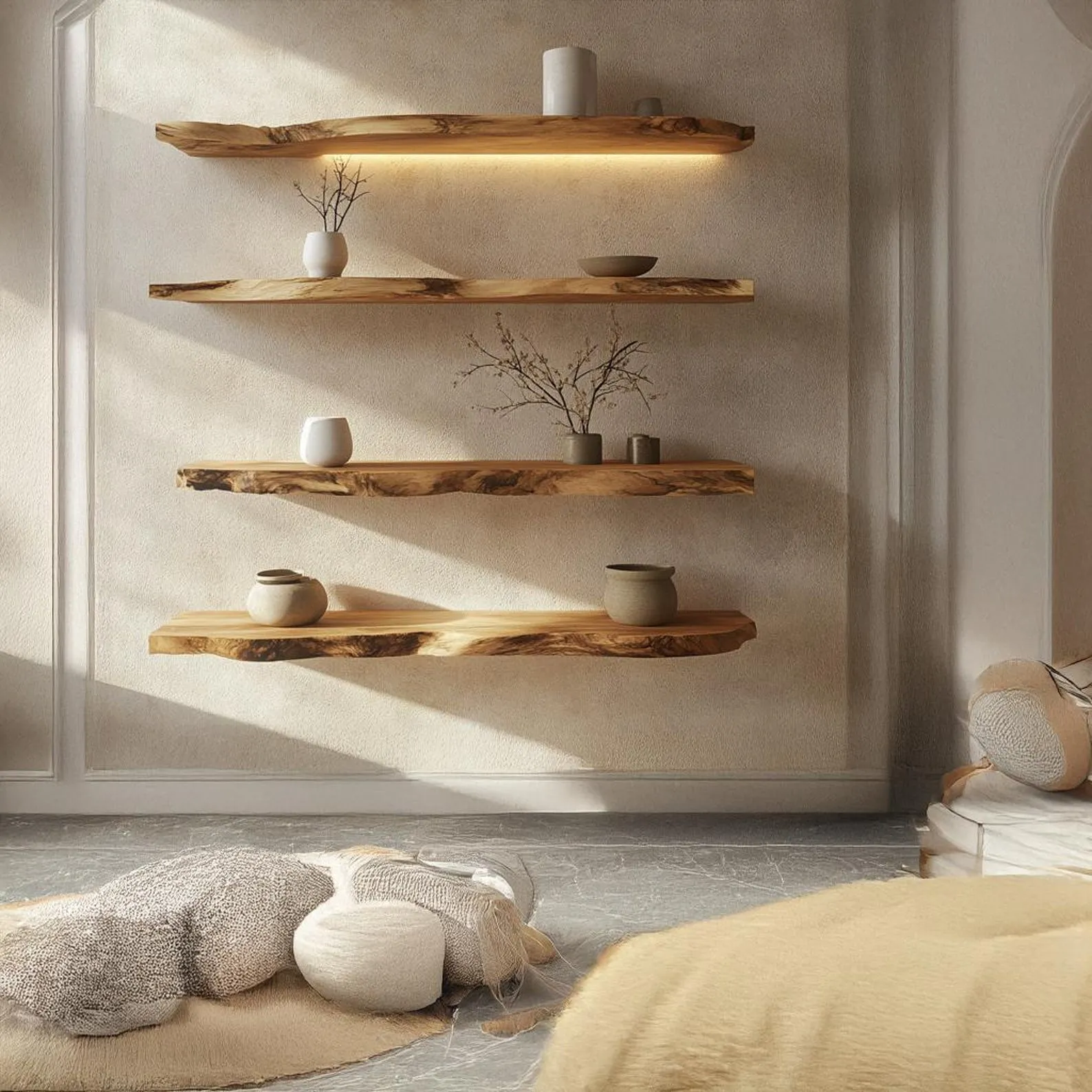 This live edge wood floating shelf adds character and extra storage to any wall. The shelf is crafted from solid timber with a natural edge, so the front follows the original shape of the tree. Its rustic look pairs well with plant displays, framed prints and small decorative objects, making it ideal for living rooms, bedrooms or hallways.