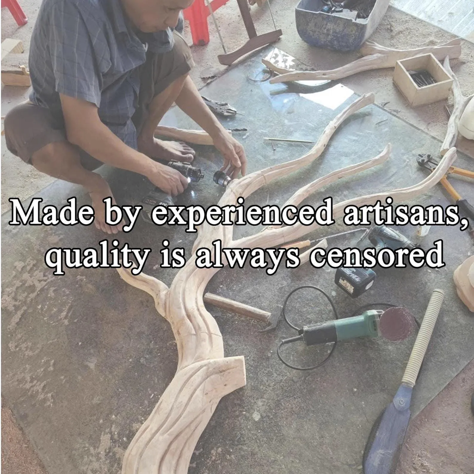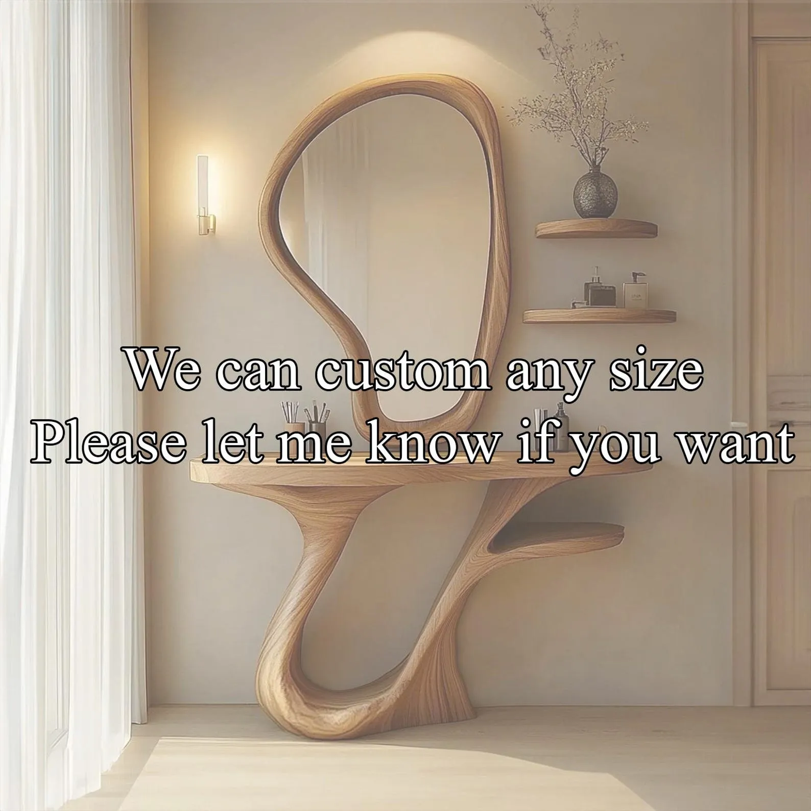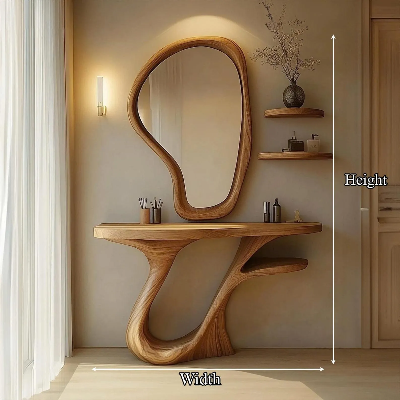 This rustic live edge wood vanity console table set with mirror creates a natural focal point in a bathroom or entryway. The solid wood top keeps part of the original tree edge, giving the piece an organic outline with visible grain and knots. A matching framed mirror completes the set so you have a convenient spot for getting ready or checking your appearance.