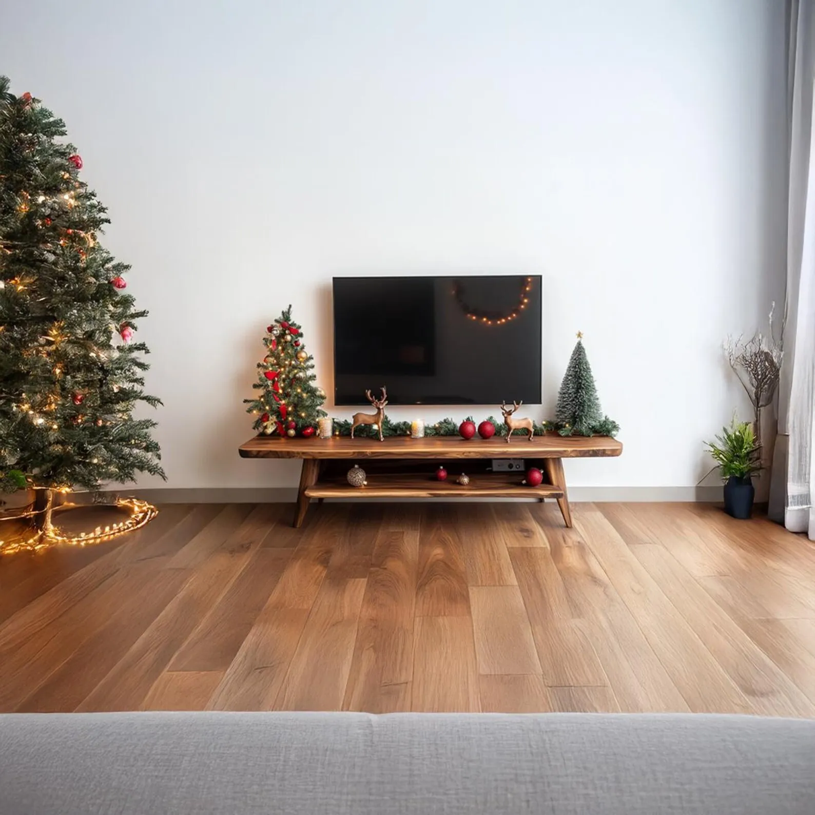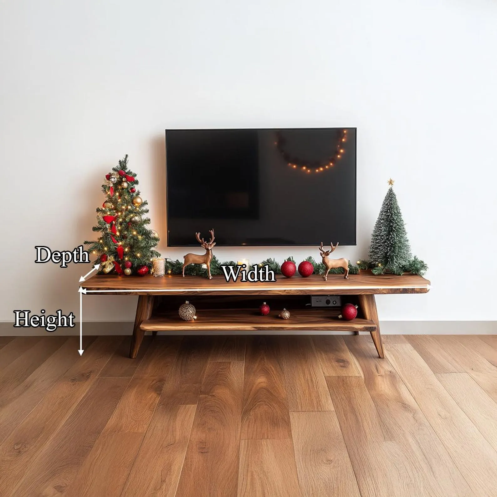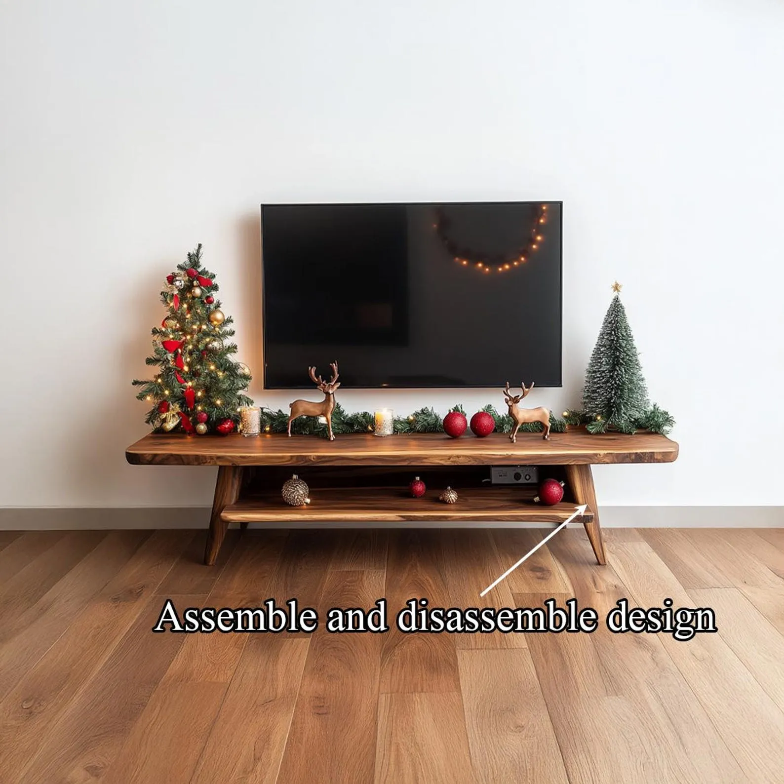 This solid wood TV stand offers generous space for screens, media players and storage. A wide top supports the television, while lower shelves and cabinet sections hold consoles, game controllers and boxes. Natural grain patterns on the front panels add interest without needing additional decoration.